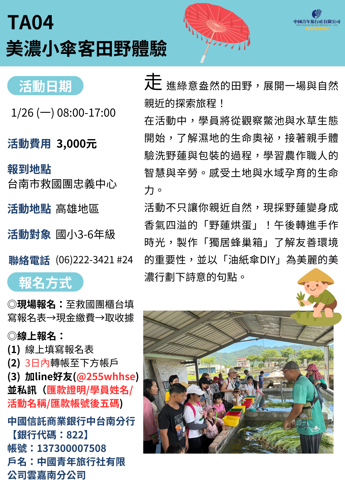 115年冬令營:【B主題營隊】TA04 美濃小傘客田野體驗