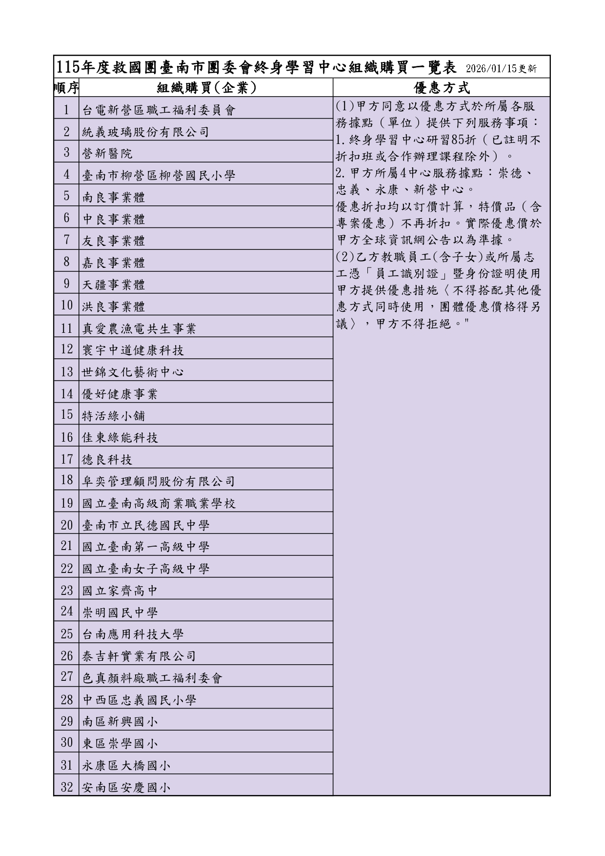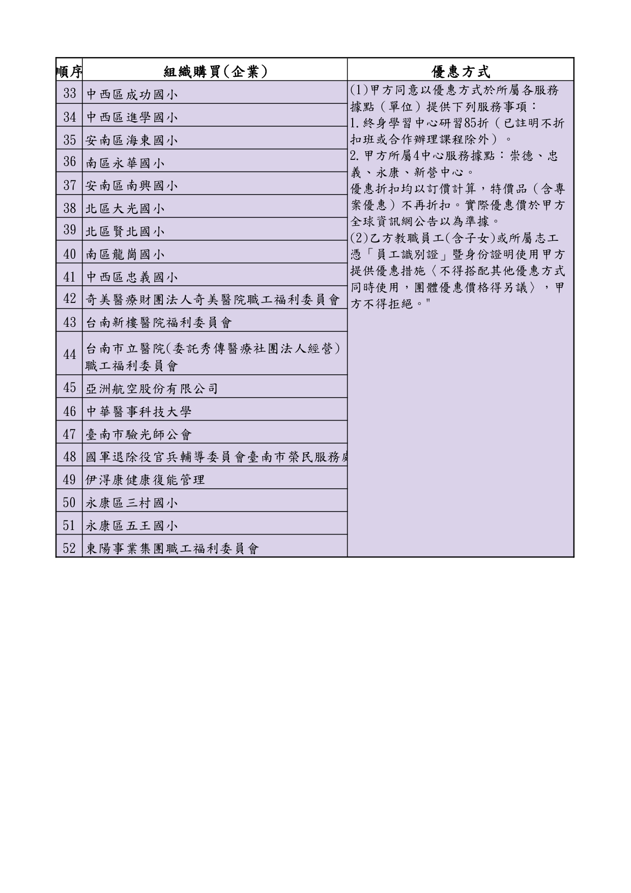 (1)甲方同意以优惠方式于所属各服务据点(单位)提供下列服务事项: 1.终身学习中心研习85折(已註明不折扣班或合作办理课程除外)。 2.甲方所属4中心服务据点:崇德、忠义、永康、新营中心。 优惠折扣均以订价计算,特价品(含专案优惠)不再折扣。实际优惠价于甲方全球资讯网公告以为准据。 (2)乙方教职员工(含子女)或所属志工凭「员工识别证」暨身份证明使用甲方提供优惠措施〈不得搭配其他优惠方式同时使用,团体优惠价格得另议〉,甲方不得拒绝。