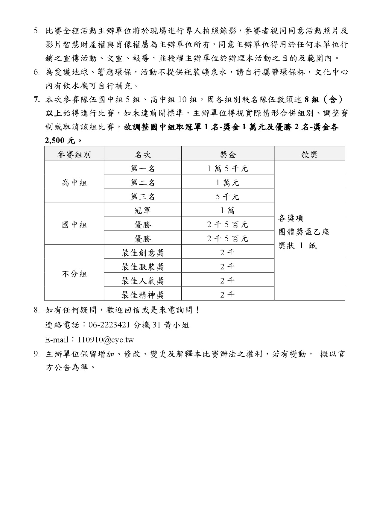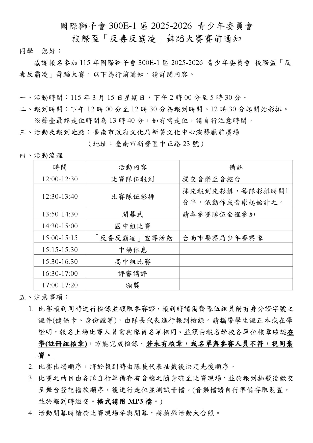 國際獅子會300E-1區2025-2026 青少年委員會校際盃「反毒反霸凌」舞蹈大賽行前通知單